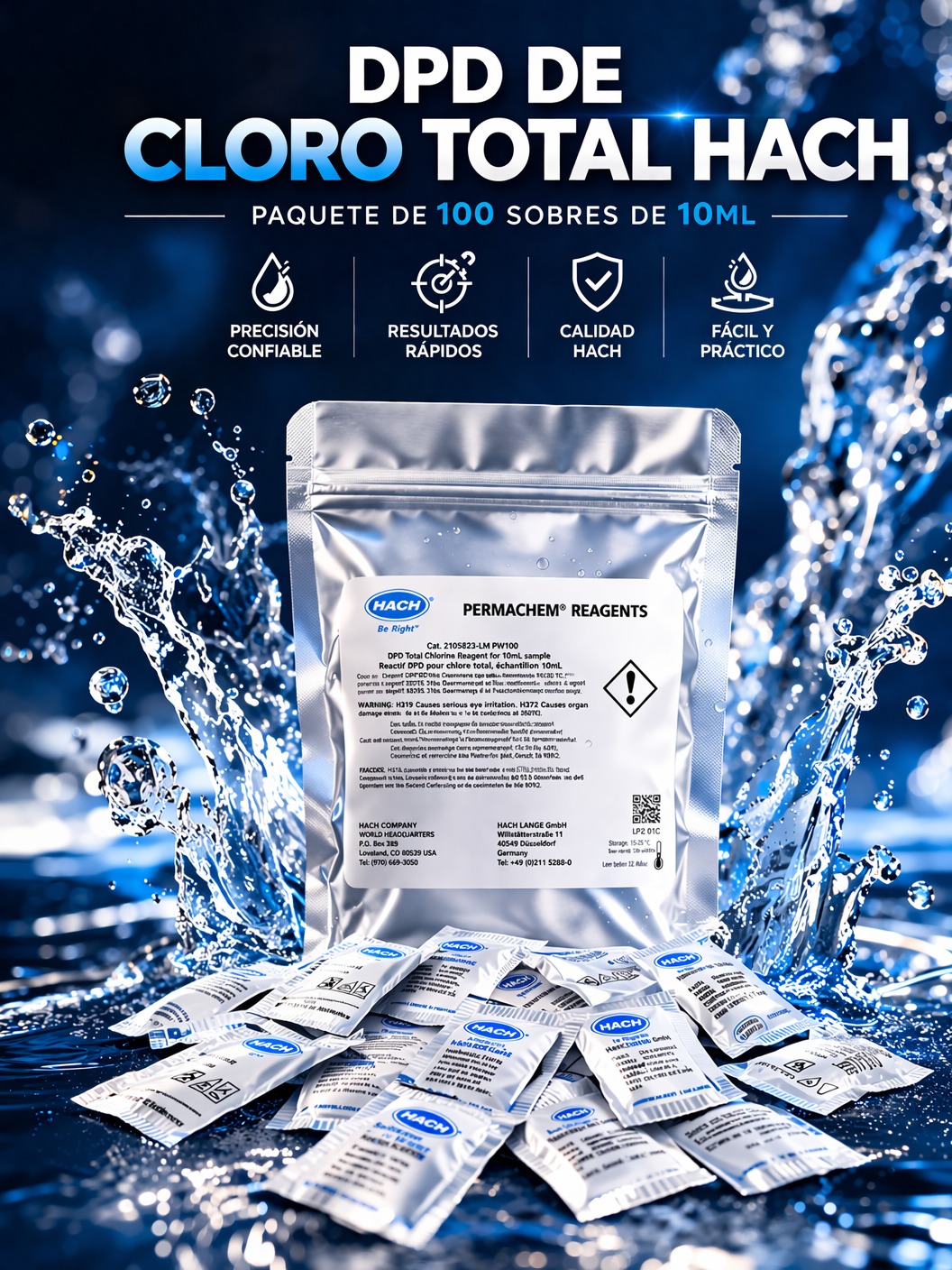 DPD EN POLVO PARA CLORO LIBRE MUESTRA DE 10ML PAQUETE X 100 UNIDADES HACH